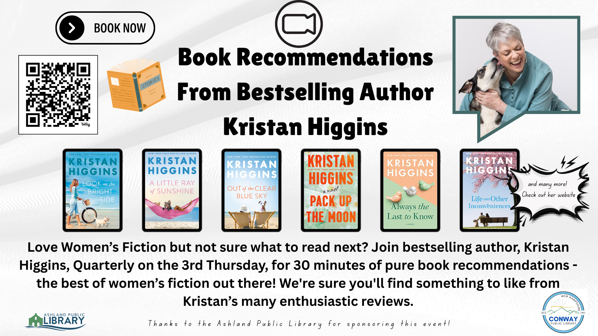 Love Women's Fiction but not sure what to read next? Join bestselling author, Kristan Higgins, monthly for 30 minutes of pure book recommendations - the best of women's fiction out there! We're sure you'll find something to like from Kristan's many enthusiastic reviews. You can sign up for one session or for all!