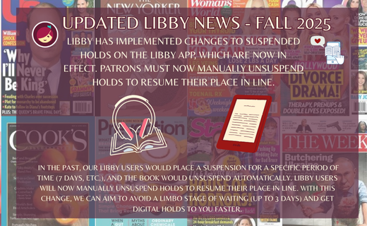 Libby has implemented changes to suspended holds on the Libby app, which are now in effect. Patrons must now manually unsuspend holds to resume their place in line. In the past, our Libby users would place a suspension for a specific period of time (7 days, etc.), and the book would unsuspend automatically. Libby users will now manually unsuspend holds to resume their place in line. With this change, we can aim to avoid a limbo stage of waiting (up to 3 days) and get digital holds to you faster.