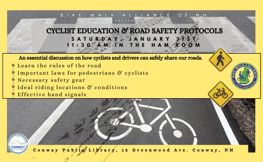 Join us Saturday, January 31st, 2026, in the Ham Room from 11:30 AM to 12:30 PM for an essential discussion on how cyclists and drivers can safely share our roads. This informative program from the Bike-Walk Alliance of NH will cover the rules of the road, key laws, required safety gear, ideal riding locations, and effective hand signals. Your presence will contribute to a greater understanding of our shared responsibility in ensuring road safety for everyone. Bike-Walk Alliance of NH educates, advocates, and activates to improve conditions for walking and biking statewide.