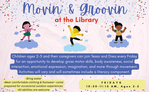 Children ages 2-5 and their caregivers can join Tessa and Drea every Friday for an opportunity to develop gross motor skills, body awareness, social interaction, emotional expression, imagination, and more through movement. Activities will vary and will typically include a literacy component. On Fridays from 10:30 AM - 11:15 AM. Please keep in mind, the last Friday of each month, the library opens at 10:30 AM and the program will be starting a bit later on that day.
