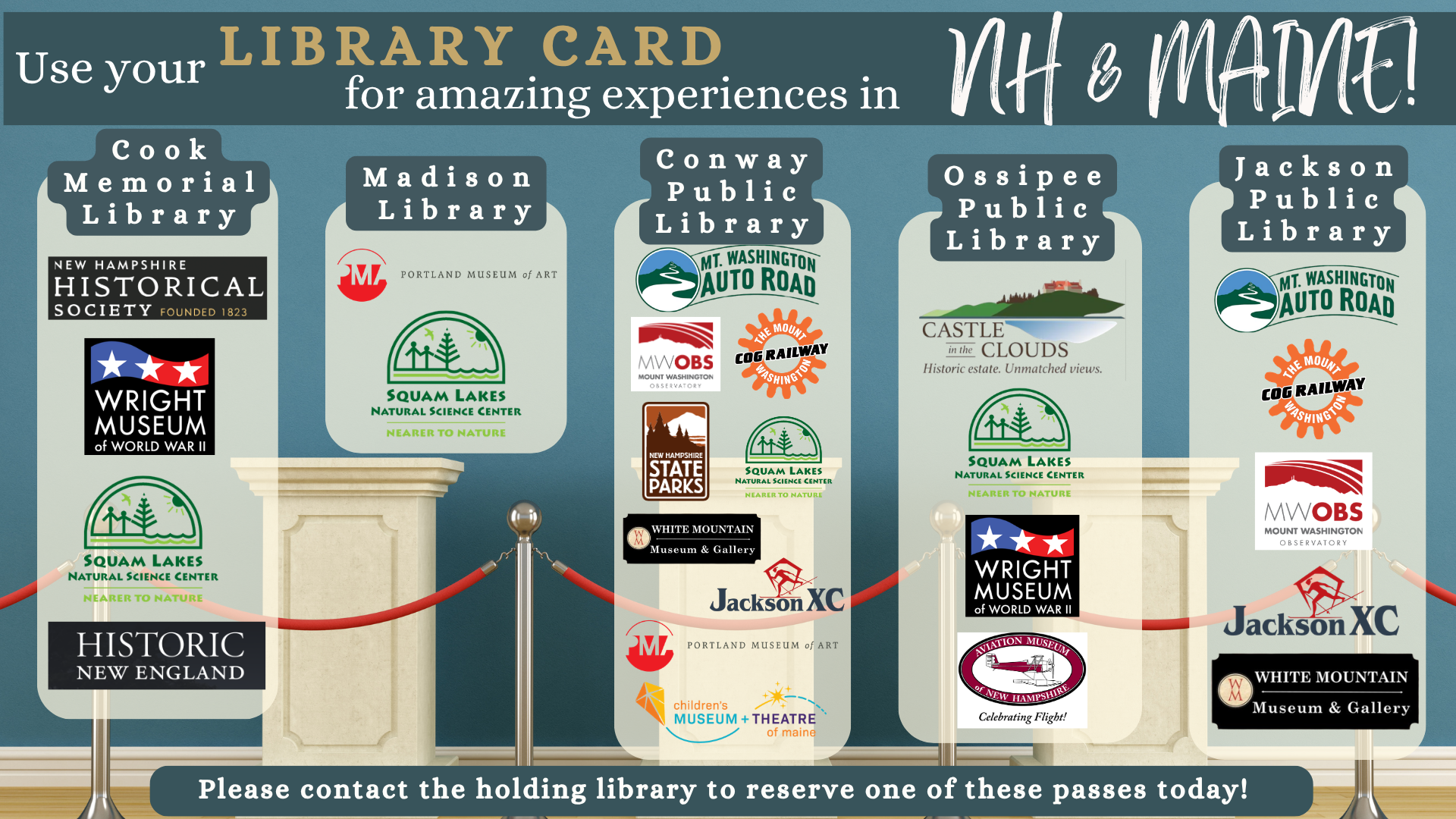 Have a current Conway Public Library card in good standing, and pick up the pass at the Library. As each museum is unique, each museum places specific restrictions on use. For more information on the use of a specific pass, please visit or call the Library at 603-447-5552.