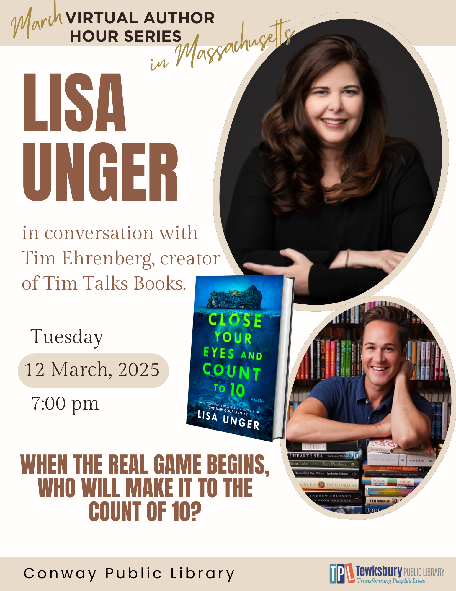 Bestselling author Lisa Unger will discuss her thriller, Close Your Eyes and Count to 10, in conversation with Tim Ehrenberg, creator of Tim Talks Books, in this installment of "Author Hour in Massachusetts."