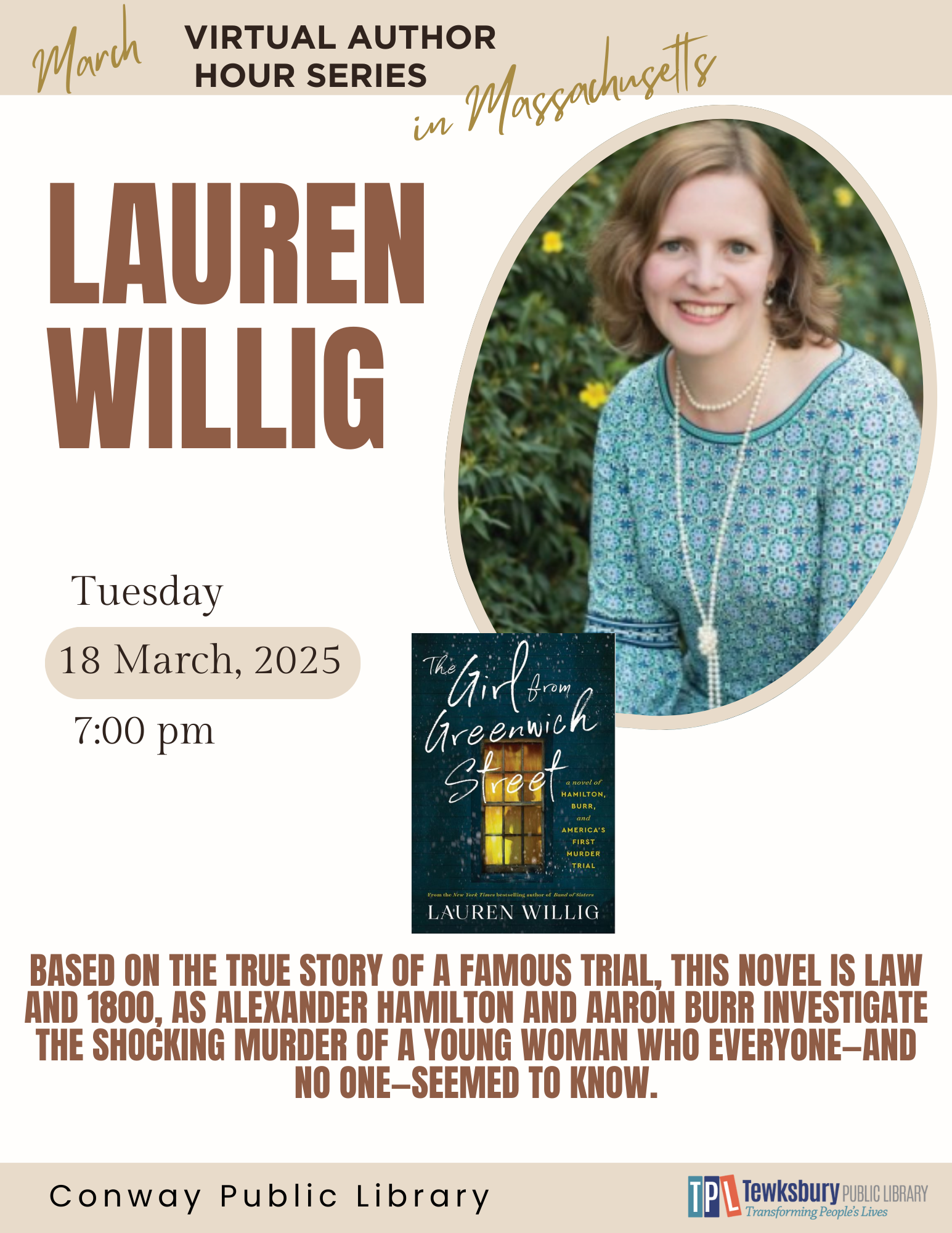 Bestselling author Lauren Willig will discuss her new historical fiction mystery, The Girl from Greenwich Street: a Novel of Hamilton, Burr and America's First Murder Trial, in this installment of "Author Hour in Massachusetts."