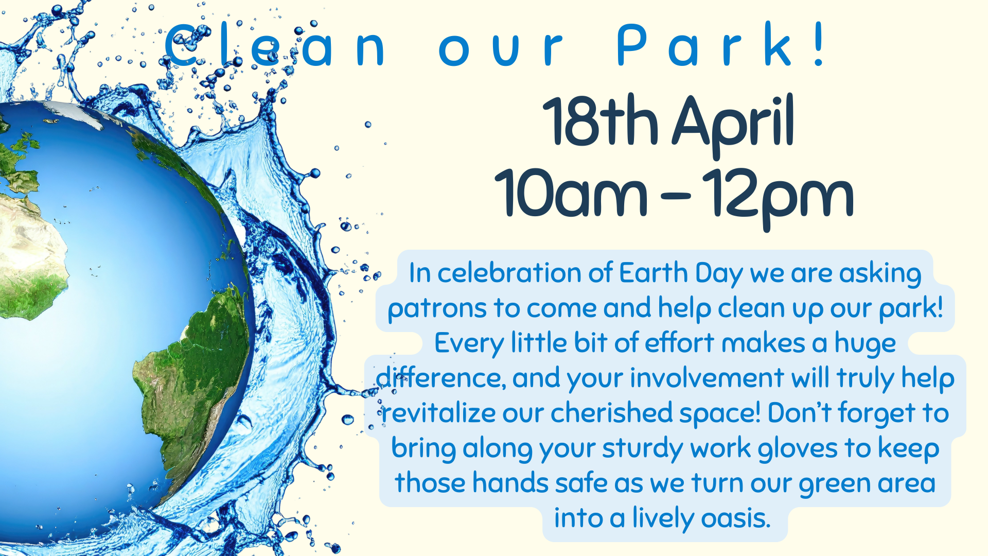 In celebration of Earth Day on Saturday, April 22nd, we invite you to join us in revitalizing our beloved park from 10:00 AM to 12:00 PM. Your participation, no matter how small, makes a monumental impact on our community green space.