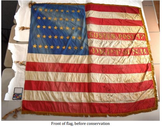 The library’s flag was used as a parade flag to honor Civil War veterans who belonged to Conway’s Custer Post No. 47. The group proudly carried this flag in processions every year, at encampments and Memorial Day parades, celebrating the service and sacrifice of soldiers in the American Civil War.