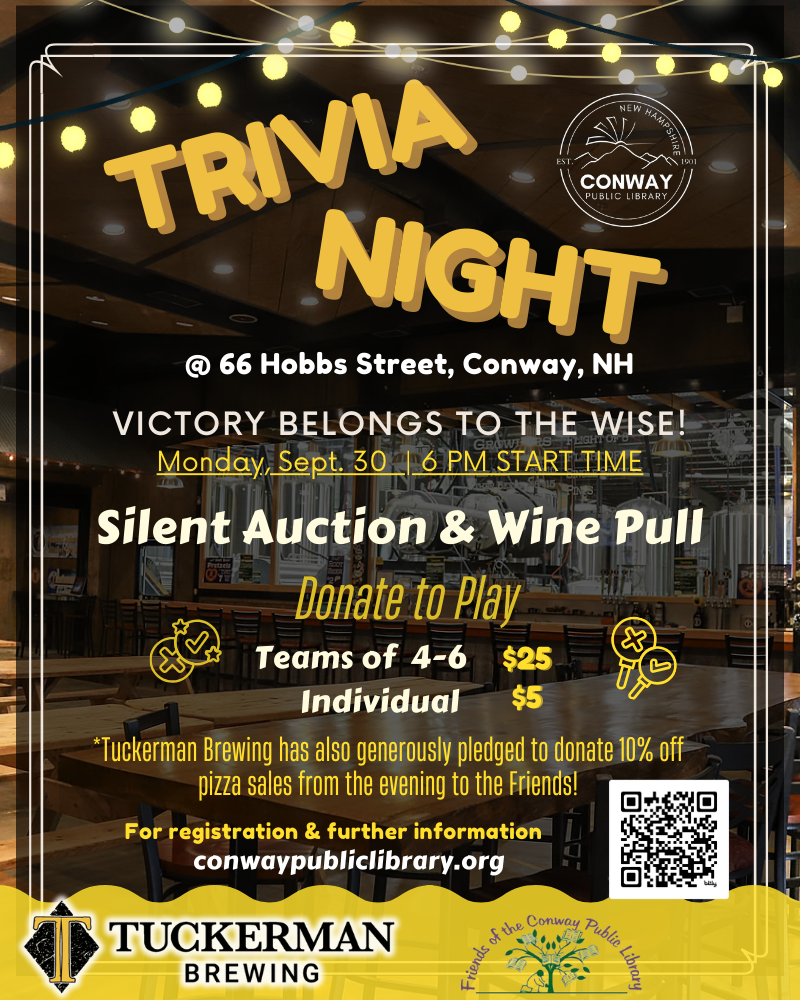 Come on down to Tuckerman's on Monday, September 30th for a fun-filled evening of brain-teasing questions and great company! Test your knowledge while supporting The Friends of The Conway Public Library.
