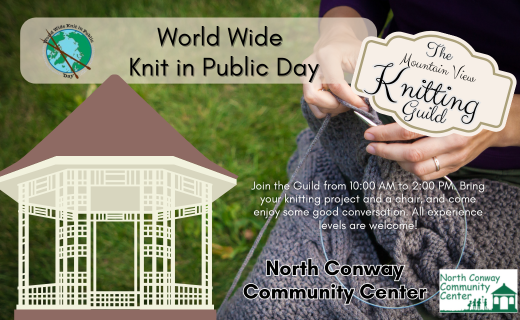 Come join The Mountian View Knitting Guild on Saturday from 10:00 am to 2:00 pm in North Conway Community Center, near the Gazebo. There will be a sign banner and canopy. Bring a knit project, chair, and come for good converstation. All are welcome.