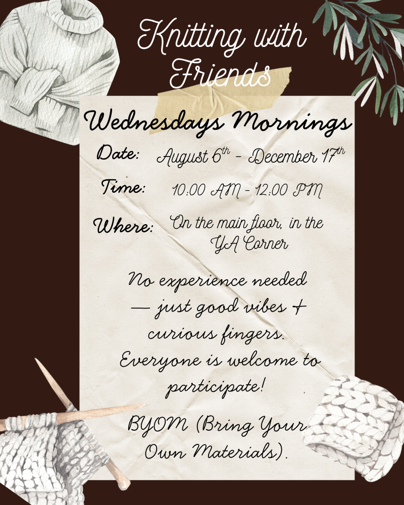Join us for a relaxing couple of hours of knitting and conversation with friends every Wednesday, starting August 6th, from 10:00 AM to 12:00 PM.