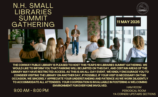 NH Small Libraries Summit Room Reservation: Monday, May 11, 2026 - 9:00am to 8:00pmEvent Category: AdultCommunityEvent Location: Periodical RoomName of Organization: CPL
