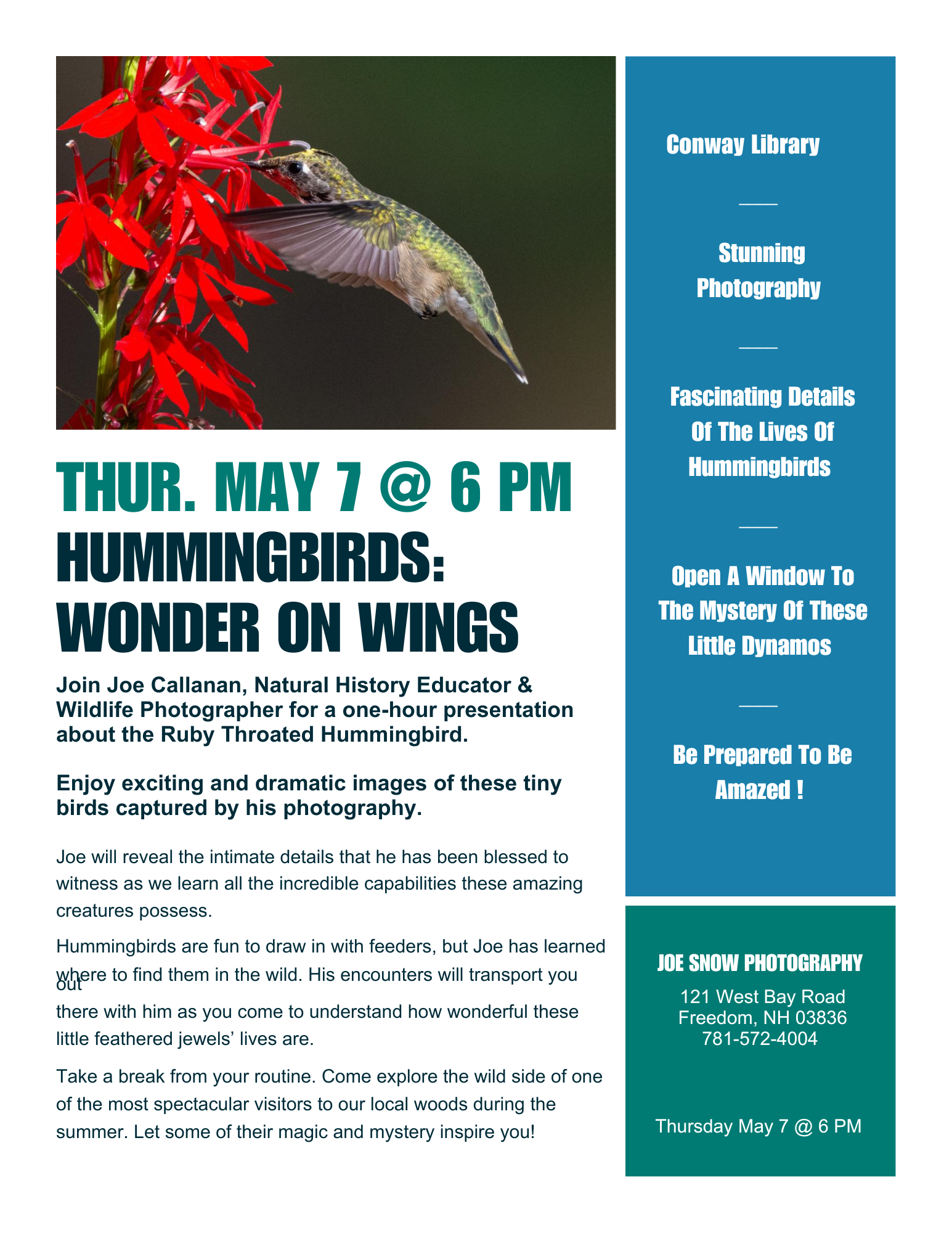 My style of photography is up close and personal and I strive to capture images that provide an intimate view that reveals the character of the animal. Ultimately my goal is to open a window to the wonder and awe that I am continually blessed to see. Joe has presented at resorts such as The Balsams, Mount Washington Hotel, local NH conservation groups and senior living facilities.