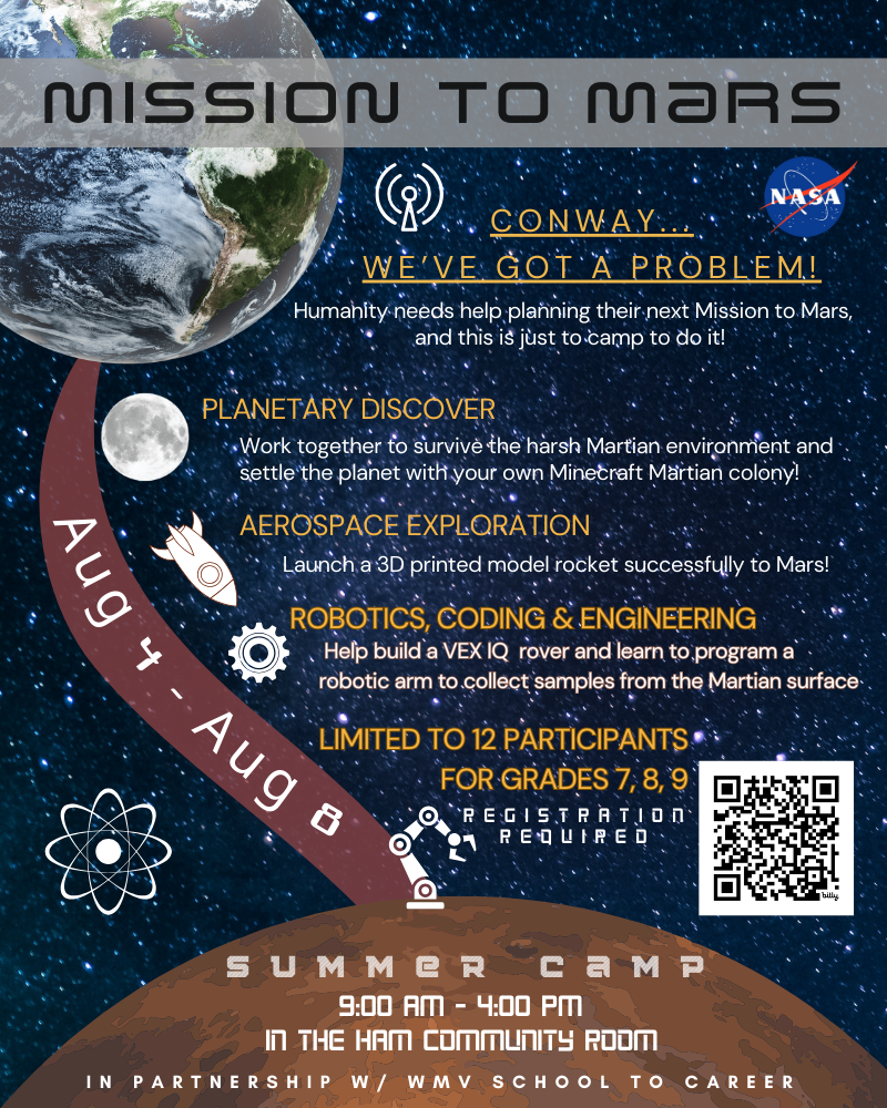 Registration is Required. Please use the link. Limited to 12 participants for grades 7, 8 , & 9 https://bit.ly/Mission2Mars25