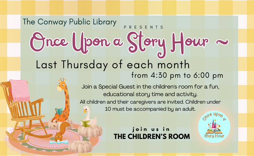 Come and Join Once Upon A Story Hour on the last Thursday of the month starting at 4:30 pm in the Children's Room. Each visit will have different stories and activities. All are welcome! Children under 10 must be accompanied by an adult.